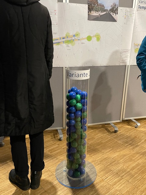 Am Ende sollten die Bürger, die zuvor am Eingang einen Plastikball erhalten hatten, diesen in eine der zwei durchsichtigen Abstimmungssäulen (für jede Variante eine Säule) einwerfen. Wer sich für keine der zwei vorgestellten Verkehrsvarianten begeistern konnte, legte seinen Ball am Eingang wieder zurück in die Aufbewahrungskiste. Variante 1 und die „Nein“-Kiste am Eingang hatten annährend gleich viel Bälle. Die Säule für Variante 2 hatte nur wenige Bälle.